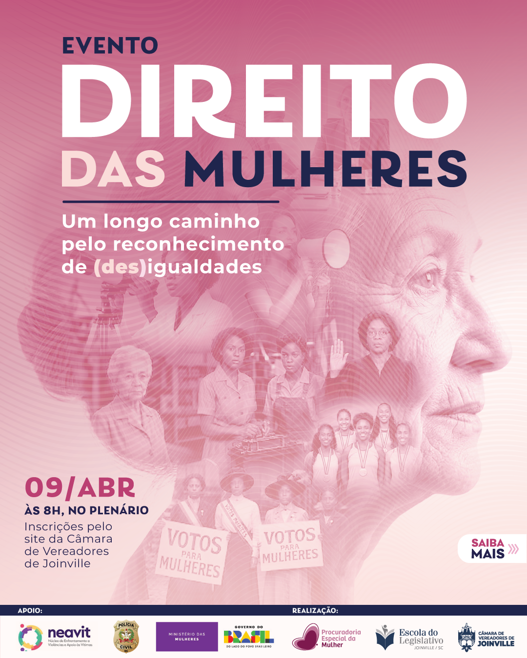 A Procuradoria da Mulher da Câmara de Vereadores de Joinville promove, nesta quinta-feira (9), o evento gratuito “Um longo caminho pelo reconhecimento de (des)igualdades”, com foco no Direito das Mulheres. A programação será realizada no plenário da Câmara, com início às 8h15.